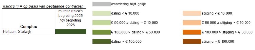 De totale risicowaardering van de actieve grondexploitatie Hoflaan bedroeg volgens de actualisering in het kader van de begroting 2025 € 345.381. De totale risicowaardering bedraagt volgens de actualisering in het kader van de begroting 2026, € 117.245. Per saldo neemt de totale risicowaardering af met € 228.136, ofwel een daling van 66%. Dit verschil wordt veroorzaakt doordat het project in een vergevorderde fase zit en de risico’s daardoor zijn afgenomen.